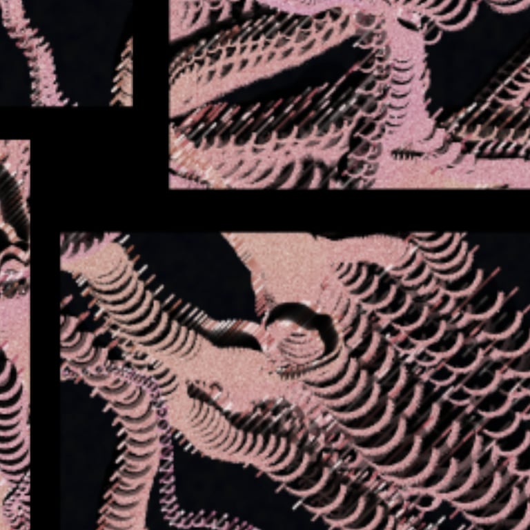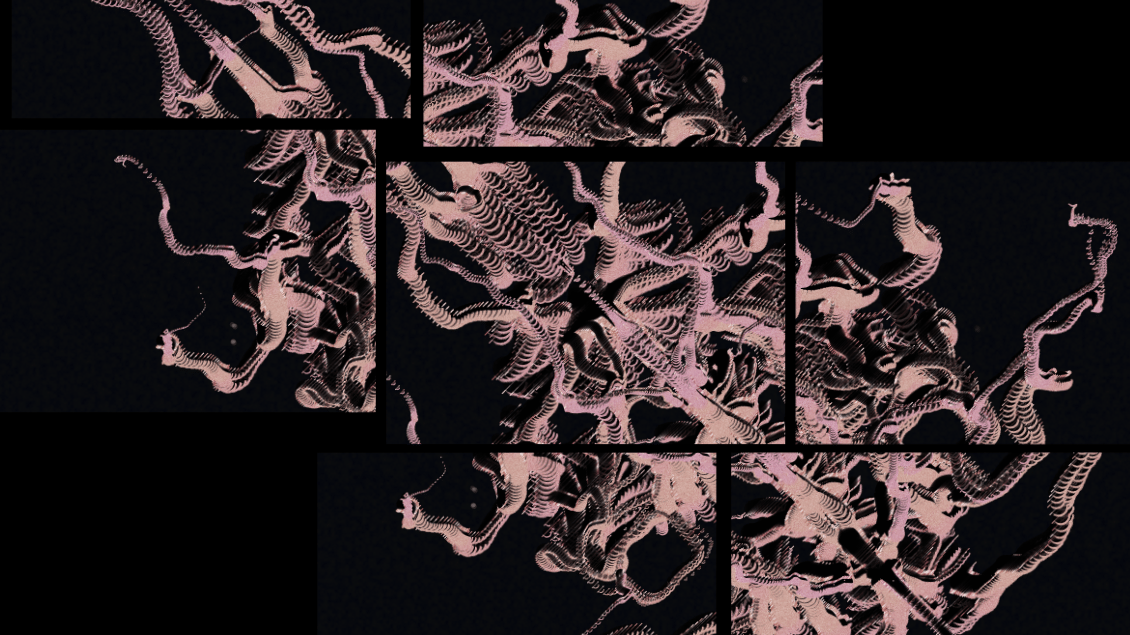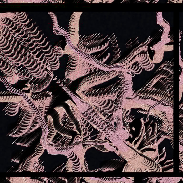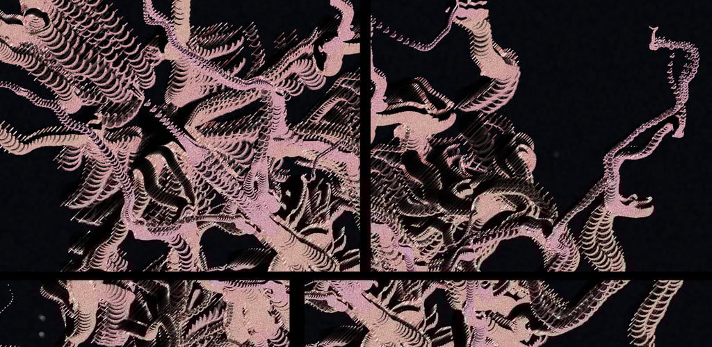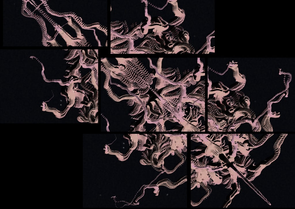 A partir d’une origine commune, un point central, des particules évoluent selon un mouvement expansionniste et aléatoire. A chaque image, la position de la particule définit le centre d’un arc de cercle et d’un segment de droite. Le mouvement s’épuise et l’image est aléatoirement découpée et samplée avant d’être sauvegardée faisant apparaître deux figures superposées, complémentaires et concurrentes qui se lient dans le regard du spectateur.
