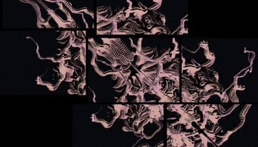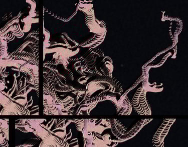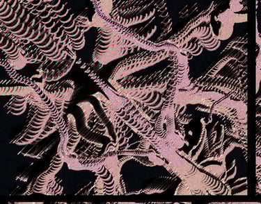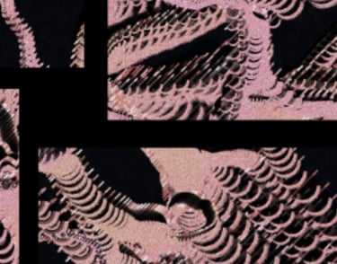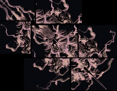 From a common origin, a central point, particles evolve in an expansionist and random movement. In each image, the position of the particle defines the center of an arc and a line segment. The movement exhausts itself, and the image is randomly cropped and sampled before being saved, revealing two superimposed, complementary, and competing figures that become linked in the viewer's gaze.