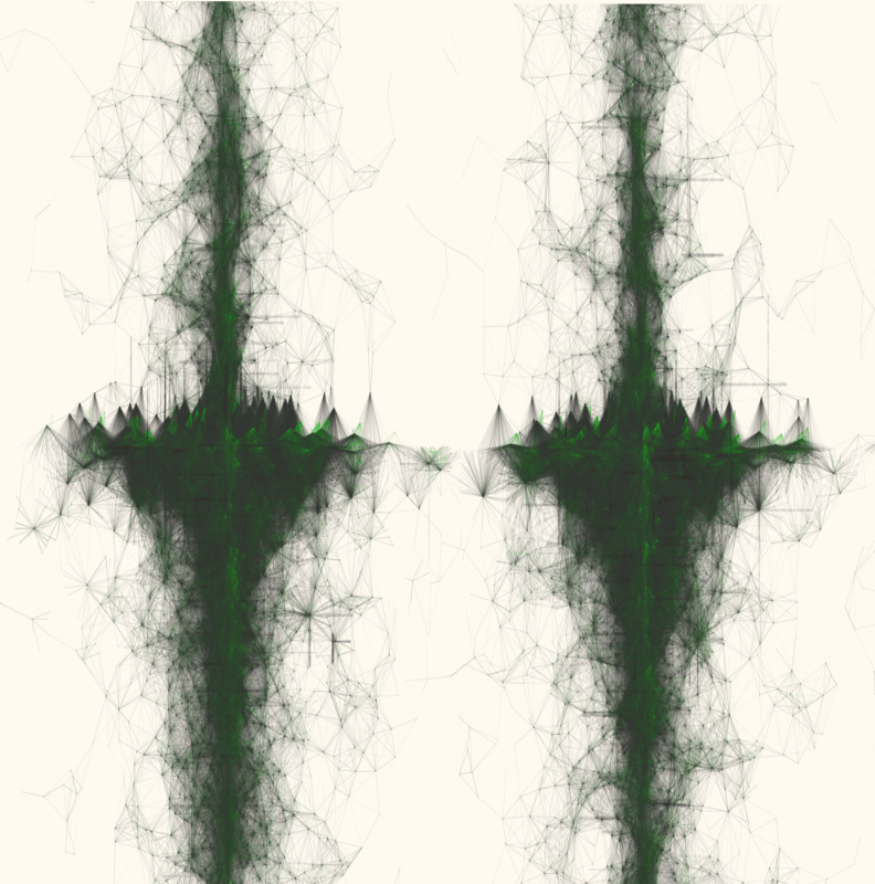 Des particules sont projetées suivant dans l’espace de travail suivant une règle qui définit des zones privilégiées. Le dessin ne fait pas apparaître ces éléments mais les liens entre chaque particule en fonction de la distance qui séparent. Une vision construite à partir des déplacements / itinéraires entre les particules en écho aux réseaux, connexions, liens, trajets qui construisent notre rapport au monde.